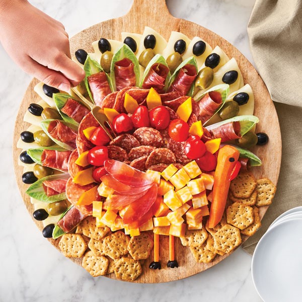 Set out a conversation-starter tray of salami, proscuitto, olives, endives, carrots, roasted red peppers, and cubed and sliced cheeses arranged to resemble a turkey. Keep it fresh and ready for the party by assembling it the morning of; cover and refrigerate until guests arrive.