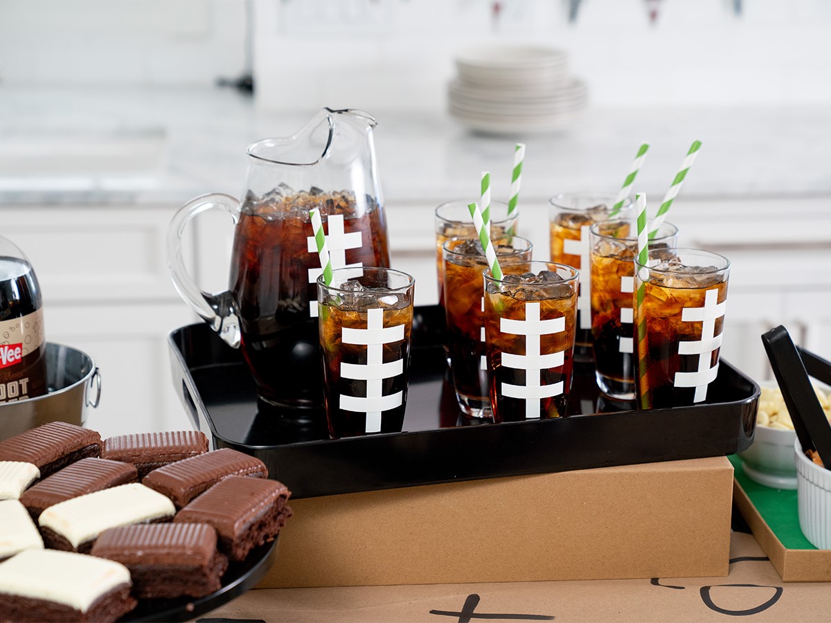Use white craft tape to add football laces to drinking glasses. Cut one long piece of tape to run vertically up the glass, and three smaller pieces to sit horizontally. Dark brown soda like root beer makes the glassware resemble footballs even more. Try it on popcorn bags, too!