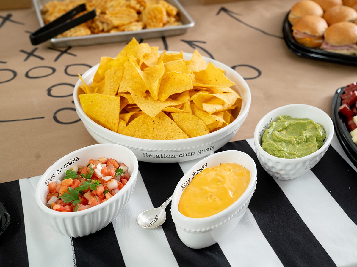 Transfer store-bought chips and dip to Mud Pie entertaining accessories like these textured bowls. Each dish is debossed with clever food puns like “Relation-chip goals” that will get your guests talking.