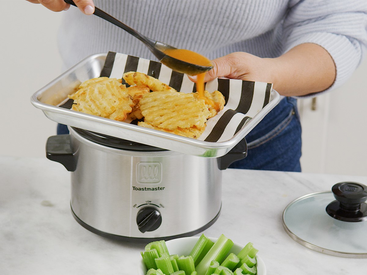 Guests will love dishing this silky, spicy goodness over crispy waffle fries. Make a semi-homemade gravy for Buffalo Chicken Poutine with light lager beer, Frank’s RedHot sauce, water and gravy mix. Heat and serve in a miniature slow cooker alongside toppings for guests to help themselves throughout the game.