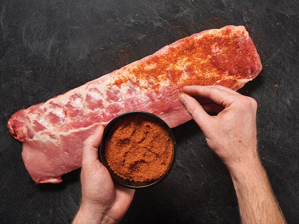 Lightly coat the ribs with the seasoning rub, gently patting it into the meat. Avoid massaging it into the meat, which will make the flavor too strong.