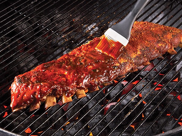 After 3 hours, brush ribs on both sides with barbecue sauce. Continue to grill ribs, bone side down, over very low indirect heat for 30 to 60 minutes.