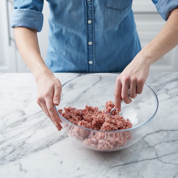 Mix meat and red onion in a bowl using a fork. Avoid overworking the meat to keep the texture of the patties tender.