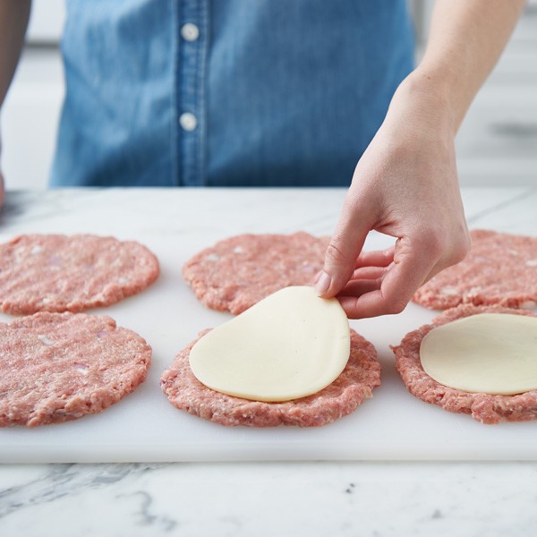 Place slices of cheese in an even layer in the center of four of the patties, leaving a ½-inch border along the edges.