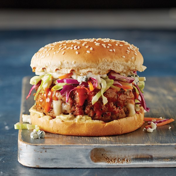For an extra pop of flavor, add coleslaw and blue cheese on top of burgers and finish by placing burgers on toasted sesame buns.