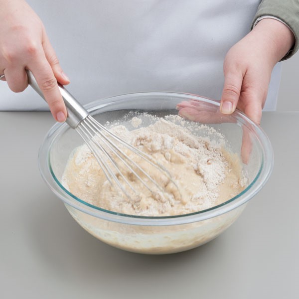 2. Whisk together together 2 cups of pancake mix, 1 1/2 cups milk, 2 eggs, 2 tablespoons of canola oil, 2 teaspoons vanilla, and1 teaspoon of cinnamon until well-combined.