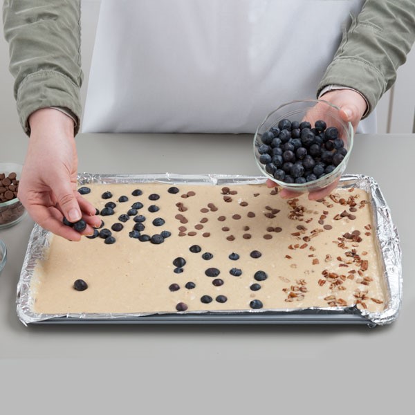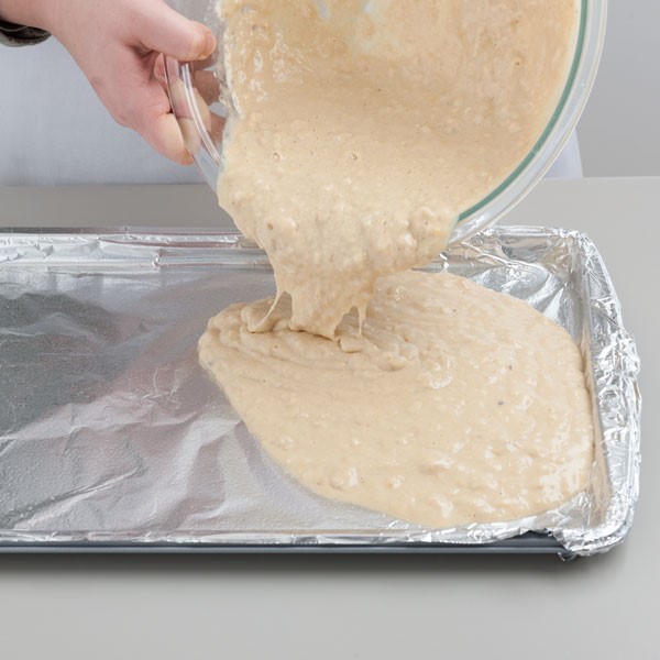 3. Pour batter into a foil-lined and sprayed 15x10x1-inch baking sheet; use a spatula to spread the batter evenly throughout the pan.