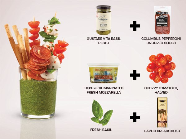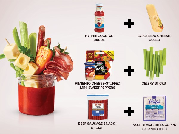 Bloody Mary Jarcuterie? Yes, please! Fill a cocktail glass or mason jar with coctail sauce and garnish with pimiento-stuffed mini sweet peppers, sausage snack sticks, salami slices, celery, and more. Shop for these ingredients online!