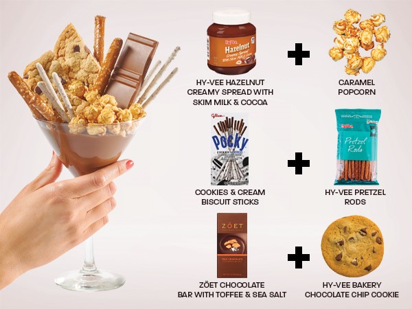Jarcuterie doesn't need to be all about the meat and cheese. Treat your sweet tooth with martini glasses piled high with chocolate hazelnut spread, Hy-Vee Bakery cookies, pretzel rods, and caramel corn. Get everything you need for this sweet idea on Aisles Online!