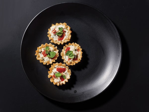 Goat Cheese Tartlets: Preheat oven to 350 degrees. Combine herb and garlic chevré and chopped roasted red pepper. Spoon mixture into thawed frozen phyllo shells. Bake for 10 minutes or until heated through. Garnish each with fresh oregano leaves, if desired.