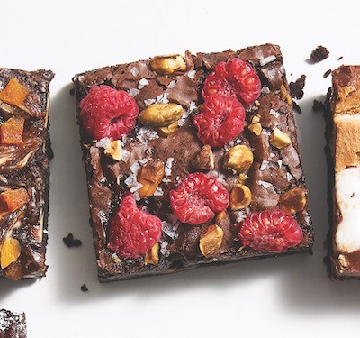 Prepare brownie mix according to package directions, except top with 1/2 cup fresh raspberries and 1/4 cup chopped pistachios during the last 15 minutes of baking. Sprinkle with sea salt flakes.