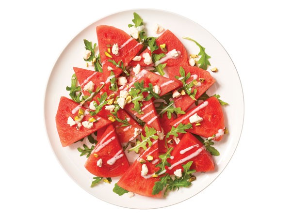 Watermelon Wedge Salad: Top 13 watermelon wedges with 1/2 cup arugula, 1/4 cup crumbled Soiree feta cheese, and 2 tablespoons pistachios. Drizzle with 3 tablespoons Hy-Vee poppy seed salad dressing. Serves 3.Butternut Squash