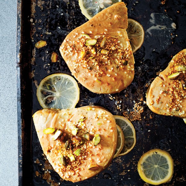 Bake: When you want to crust a tuna with nuts or crumbs such as pistachios, pecans, or bread crumbs, baking at 450 degrees is the way to go. The indirect heat won’t burn your coating. Place the tuna on a well-greased baking sheet and cook for about 15 minutes or to desired doneness.