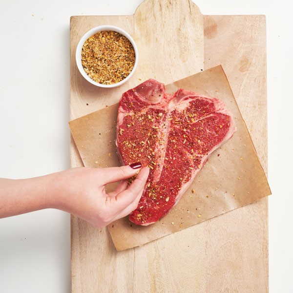 Select a steak that's at least 1-1/4-inch-thick with marbling throughout.
