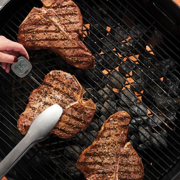Insert an instant-read meat thermometer into the center of the thickest part of the steak, away from the bone and fat.