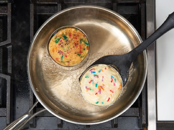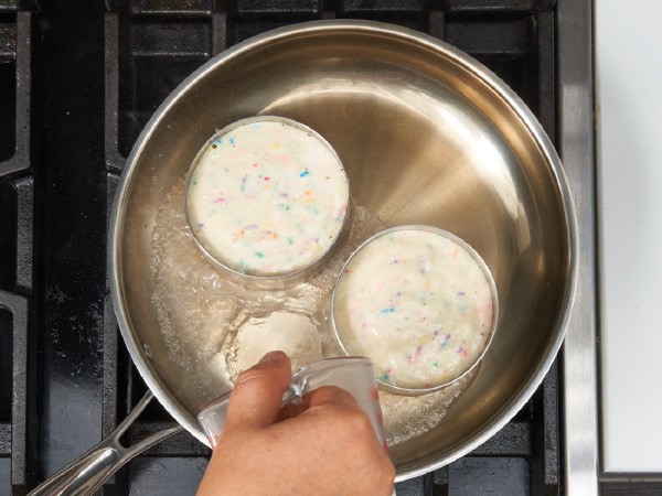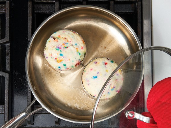 Spray 2 (3×2-1/8-inch) metal rings with nonstick spray. Place the molds in the skillet. Pour pancake batter into each mold. Pour 1/4 cup water into the skillet.