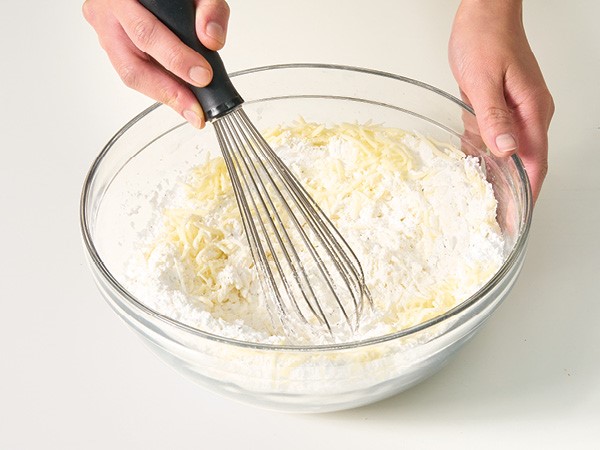 First things first, gather the dry and wet ingredients from our Gluten-Free Blue Cheese and Pear Pizza recipe. Whisk together the dry ingredients and stir in the mozzarella cheese.
