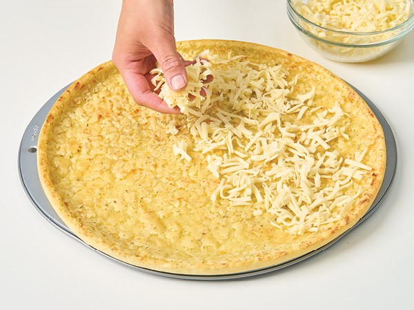 Bake for 20 minutes. Remove from oven and sprinkle with Fontina cheese. Add toppings and finish baking.