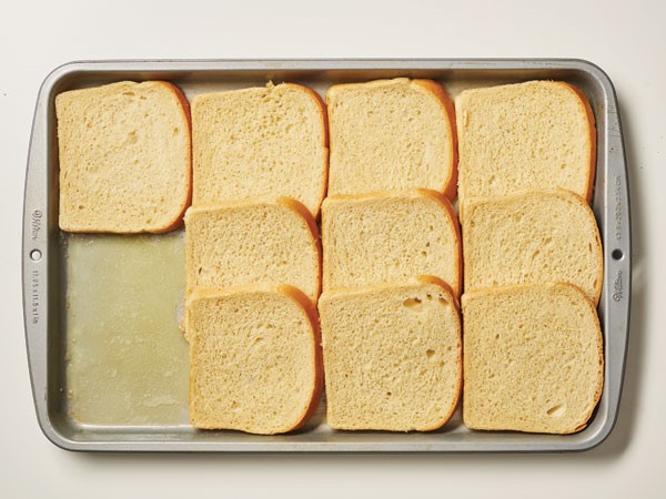 Preheat oven to 400 degrees. Brush 1/4 cup melted butter on one side of 12 (1/2-inch-thick) slices Hy-Vee Bakery white bread; arrange buttered side down on a 15x10x1-inch sheet pan.