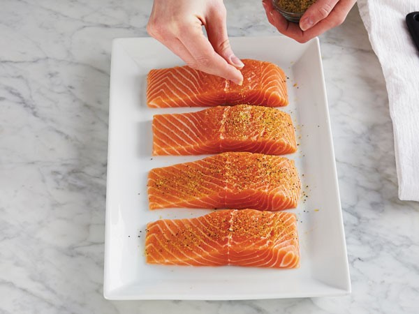 Season 4-to-6-oz. skinless salmon fillets with desired seasonings.