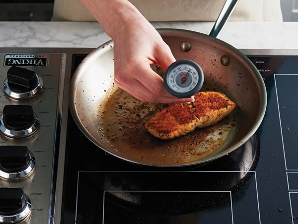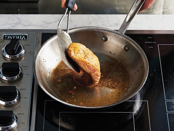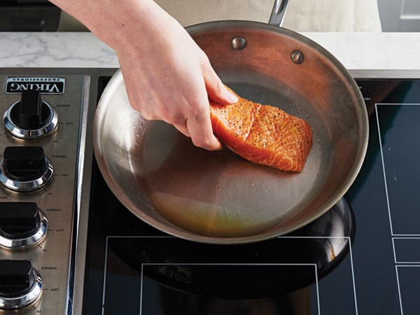 When placing the salmon into the hot oil, the water within the salmon will make the hot oil splatter. To avoid hot oil splattering on your arms and clothing, tip the skillet away from you when adding the salmon to the skillet.