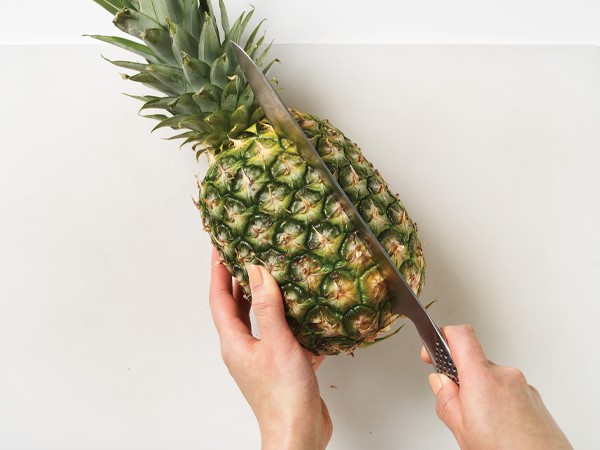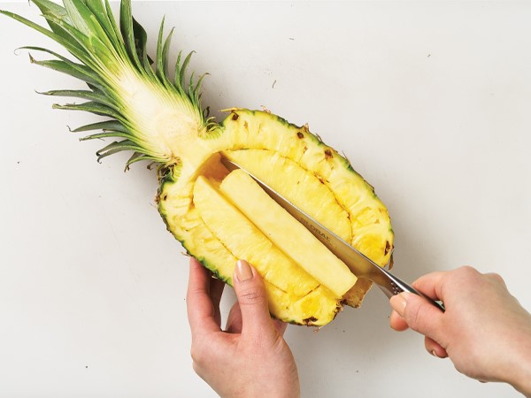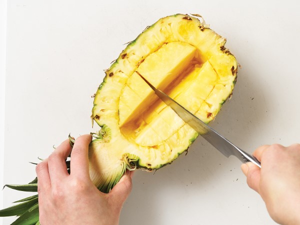 Using a sharp chef's knife, carefully slice the pineapple in half lengthwise (remove the crown if desired).