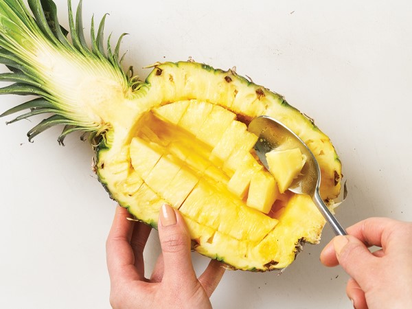 Use a spoon to scoop out the fruit wedges. Repeat with the other pineapple half to create two boats.