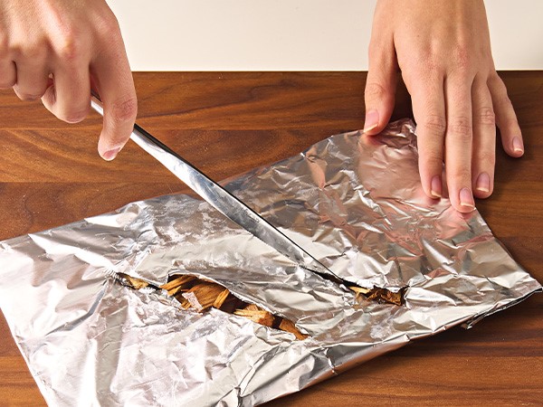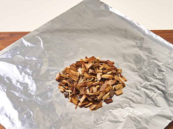 Soak 1 cup wood chips in water for at least 1 hour. Cut an 18-inch square of aluminum foil. Place soaked wood chips in the center of the foil.