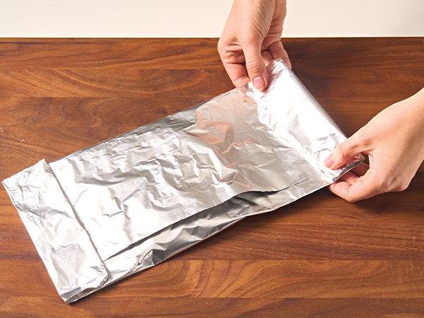 Fold one side of the foil over to completely cover the wood chips. Fold the opposite side to cover. Double-fold the two remaining sides to seal.