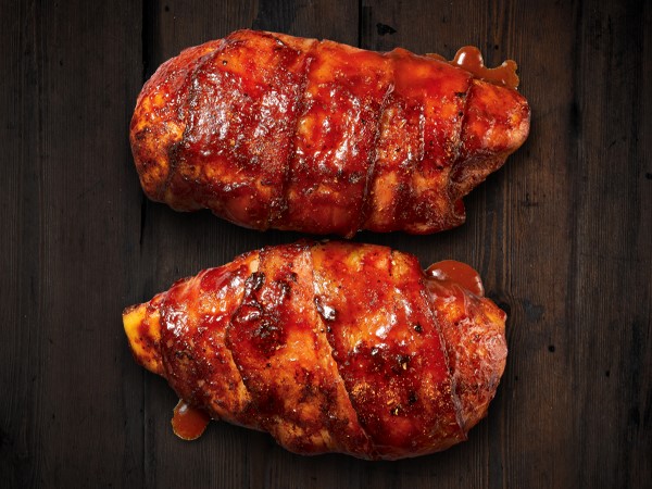 Rub 4 (8-oz.) Hy-Vee True boneless, skinless chicken breasts with Kansas City-Style BBQ rub; let stand 30 minutes. Wrap each breast with 2-1/2 slices Hy-Vee Country Smokehouse thick-sliced hickory-smoked slab bacon. Bake at 375 degrees for 35 minutes. Brush with KC-style BBQ sauce; bake 5 to 10 minutes or until 165 degrees. Serve with additional BBQ sauce. Serves 4.