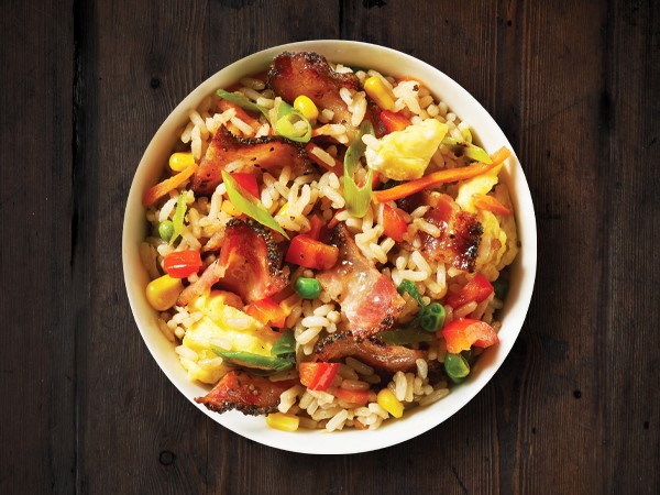 Cook and cut up 6 slices Hy-Vee Country Smokehouse thick-sliced black peppered bacon. Combine with 2 (10-oz.) pkgs. frozen white rice with mixed vegetables, 3 Hy-Vee large beaten eggs, and 1/4 cup each sliced green onions and chopped red bell pepper. Add 1/4 cup mirin (Japanese sweet rice cooking wine), 1 tablespoon Hy-Vee soy sauce, 1 tablespoon refrigerated ginger paste, and 1 tablespoon sesame oil. Heat through. Makes 4 cups.
