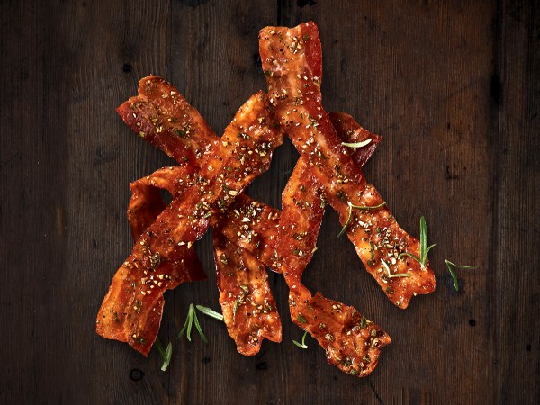 Bake 8 slices Hy-Vee center-cut bacon on a wire rack in a rimmed baking pan at 400 degrees for 7 minutes. Pat drippings from bacon with paper towels. Stir 1/4 teaspoon coarse-ground pepper into 2 tablespoons Hy-Vee Select 100% pure maple syrup; brush on bacon. Sprinkle with 1-1/2 tablespoons chopped fresh rosemary. Bake 15 to 17 minutes or until edges become crisp. Cool bacon 5 minutes before serving. Serves 8 (1 slice each).