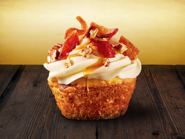 Cook 18 slices Hy-Vee Hickory House thick-sliced maple-flavored smoked bacon. set aside 8 slices; chop 10 slices. Bake 1 (16.5-oz.) pkg. Hy-Vee yellow cake mix for cupcakes according to package directions, except fold chopped bacon into batter. Frost cupcakes with 1 (16-oz.) container Hy-Vee buttercream frosting. Cut up remaining bacon; sprinkle bacon and toasted chopped Hy-Vee pecans on frosting and drizzle with Hy-Vee Select 100% pure maple syrup. Makes 24 cupcakes.