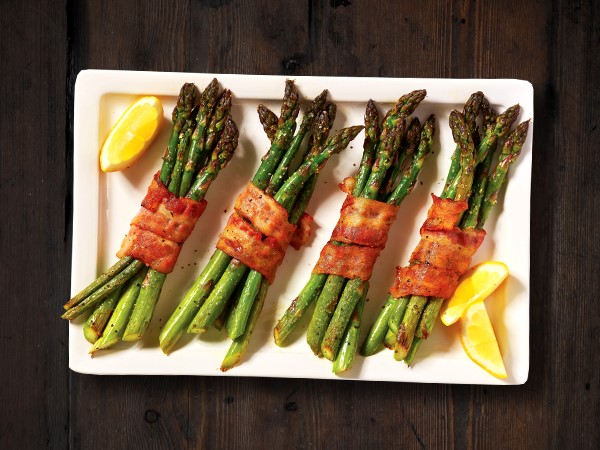 Toss trimmed asparagus spears with Gustare Vita olive oil; sprinkle with Hy-Vee lemon-pepper seasoning. Wrap asparagus bundles with Hy-Vee center-cut bacon. Bake on a rack in a rimmed baking pan at 400 degrees for 16 minutes or until bacon is crisp. Serve with lemon wedges. Serves 4.