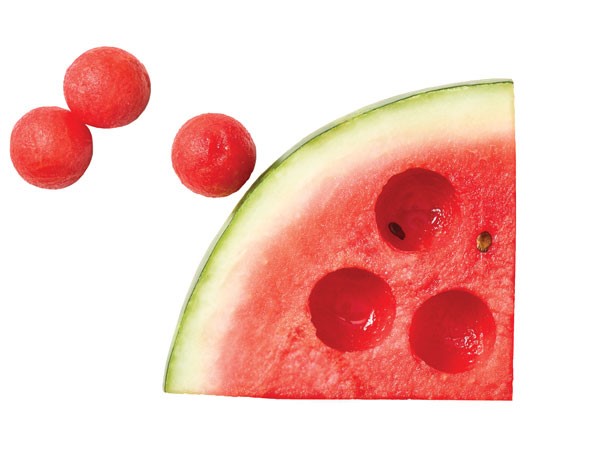 Cut the watermelon in half and use a melon baller to gently scoop out the flesh for sphere-shaped bites. Use these balls where you would use chopped watermelon: in salads or for a cocktail garnish.