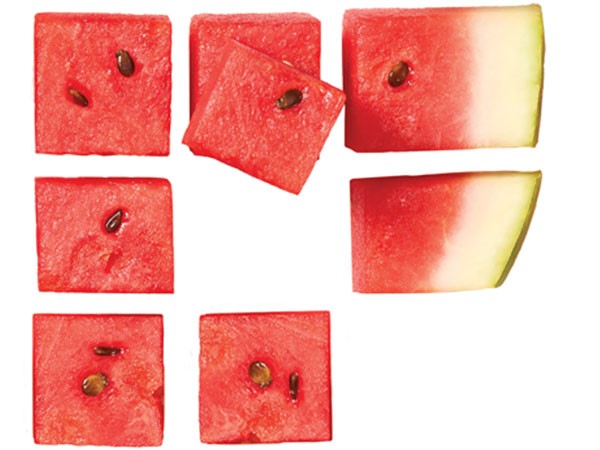 Cut watermelon into sticks, then slice crosswise, creating 1-inch cubes. Toss into salads or use to create skewers for appetizers.