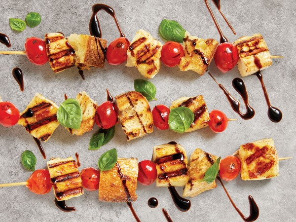 Thread cubes of Kryssos Company Halloumi cheese, cherry tomatoes, and cubes of Hy-Vee Bakery sourdough bread on pre-soaked wooden skewers. Grill 3 minutes on each side over medium-high heat. Drizzle with Gustare Vita balsamic glaze and garnish with fresh basil, if desired.