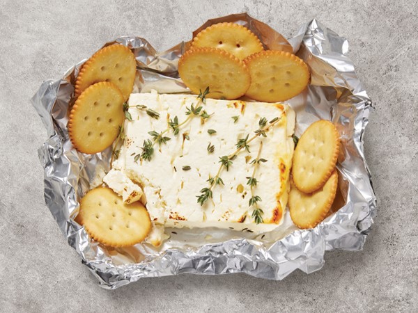 Place 1 (8-oz.) block Soiree traditional feta cheese block in the center of a large piece of aluminum foil. Drizzle with Gustare Vita olive oil; top with fresh thyme sprigs. Wrap with foil to seal. Grill over medium-high heat for 15 minutes.