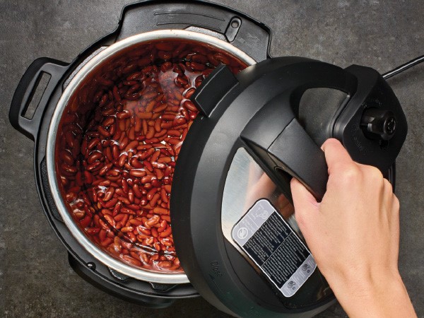 Release pressure according to manufacturer's directions, then unlock and remove the lid. Drain the beans and let them cool before using.