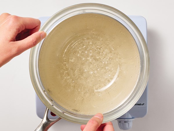 Fill a saucepan with 1 to 2 in. of water. Place a stainless steel or heat-safe glass bowl on top of the saucepan. The bowl should nest in the saucepan without touching the water.