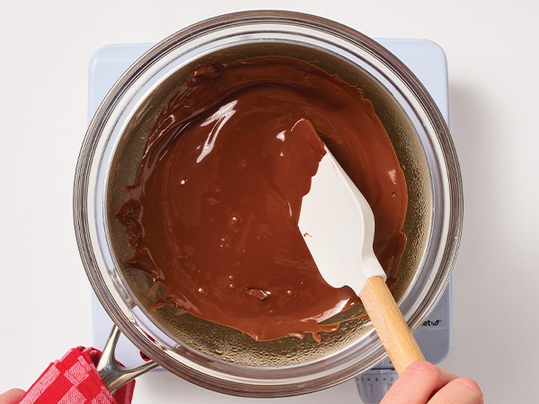 Stir frequently with a heat-safe rubber spatula until chocolate is melted and smooth. Do not allow chocolate to come into contact with steam or water. When chocolate is melted, lift bowl from saucepan and immediately dry bottom of bowl with a towel.