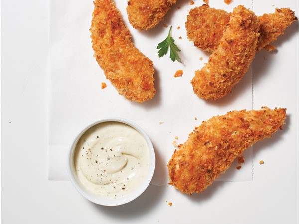 Spiced with dry ranch dressing mix and spicy tortilla chips, everyone in your family is going to love these oven-baked chicken fingers.