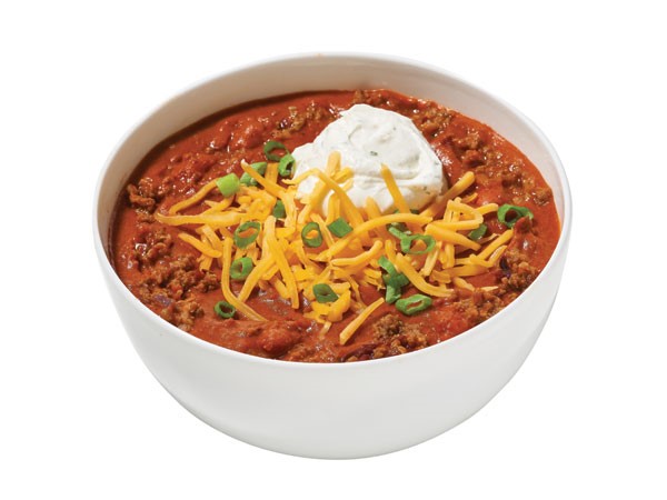 Warm 1 (32-oz.) container refrigerated Hy-Vee Brickhouse chili. Stir in 4 tsp. Hy-Vee ranch dressing mix. Serve with desired toppers. Serves 4.