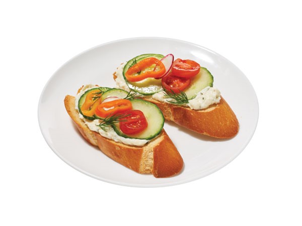 Combine 1 (8-oz.) pkg. softened Hy-Vee cream cheese, 1/2 c. Hy-Vee mayonnaise, 1 (1.12-oz.) pkg. Hy-Vee ranch dressing mix. Spread on 20 toasted Hy-Vee Bakery French baguette slices. Top with slices of cucumber, radish, Hy-Vee sweet grape tomatoes, and mini sweet bell pepper slices. Serves 20