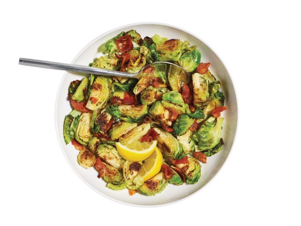 Preheat oven to 425 degrees. Cook 6 slices Hy-Vee bacon in a skillet until crisp. Drain on paper towels, then crumble. Pour 3 tbsp. bacon drippings into a bowl. Stir in 1 (1.12-oz.) pkg. Hy-Vee ranch dressing mix until dissolved. Cut 1 (1-lb.) container Hy-Vee Short Cuts Brussels sprouts into halves or quarters; toss with bacon fat-ranch mixture. Spread evenly on a rimmed baking pan. Roast 15 to 20 minutes or until crisp-tender. Transfer to a bowl. Stir in crumbled bacon; serve with lemon wedges, if desired. Serves 5.