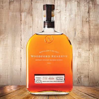 Woodford Reserve, a small- batch triple-distilled bourbon whiskey, ages at least 6 years. It has flavor notes of espresso beans, warm spices, toasty oak and rum.