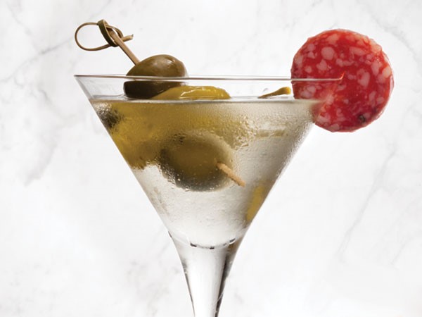 If you order a Bloody Mary and hold the tomato juice, you might end up with a cocktail that tastes like this. Garnish with a slice of salami, pepperoncini, and blue cheese-stuffed olives.