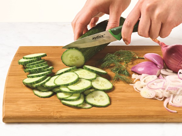 First things first, gather the produce for our Cucumbers with Shallots. Prep produce; add to jar.