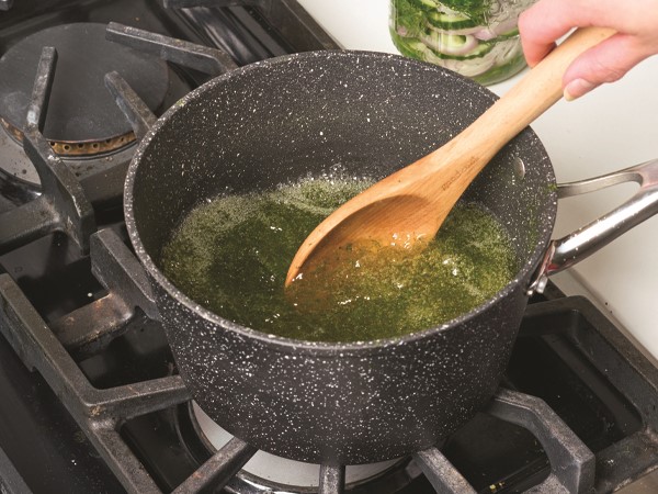 Pour brine over produce, leaving 1/2-inch headspace in jars.