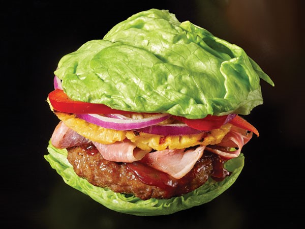Grill a pineapple bratwurst burger. Spread gluten-free BBQ sauce or ketchup on lettuce buns. Top with thinly sliced Hy-Vee deli ham, pineapple slices; grilled, fresh red bell pepper slices and red onion.